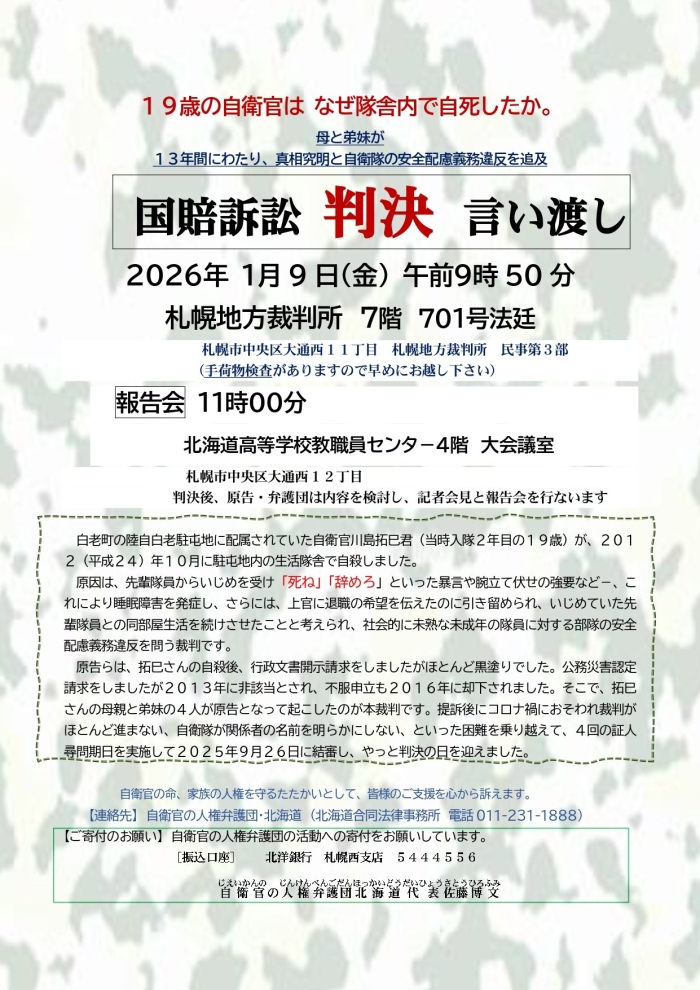2026年1月9日(金)午前9時50分に、川島拓巳さんが入隊2年目の19歳で白老駐屯地において自死したことの責任を問う国家賠償請求訴訟の判決が言い渡されます。
